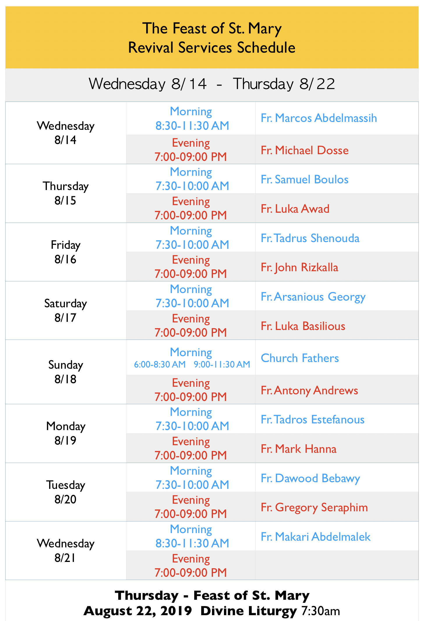 The Feast of Nayrouz is all about the newness of a new year, a new life and new beginning. We are indebted to the martyrs from Egypt. They shone as beacons of light and gave the people strength in their faith. They have kept our Coptic Orthodox Church strong until this day. If not for the fearlessness of the martyrs, the Church would not be as it is today. The feast usually falls on the 11th or 12th of September. As we celebrate the new Day, we remember our eagerness to share with the martyrs the new day in which they entered Paradise. This is the new season where the brightness of the Glory of Christ shines, and we look toward our Lord who will, God willing, open the gates of Paradise for future martyrs and for us. The last two weeks before the feast contain Divine Liturgy readings that focus on the second coming of our Lord. May we be ready for that Day.